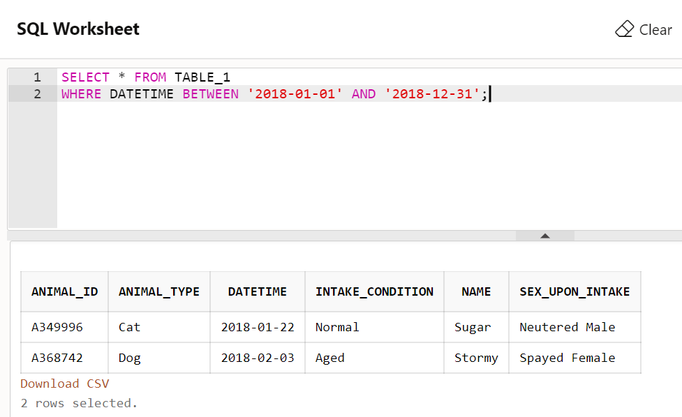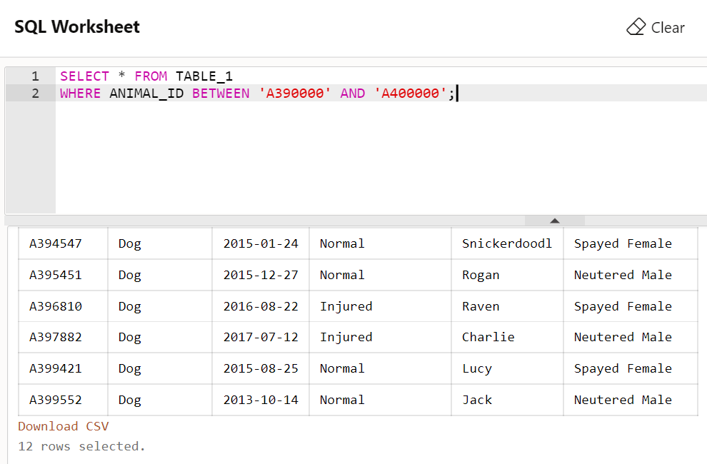 - TABLE_1의 데이터중에서 ANIMAL의 ID(ANIMAL_ID)가 A390000부터 A400000 사이의 데이터들을 조회하였습니다.