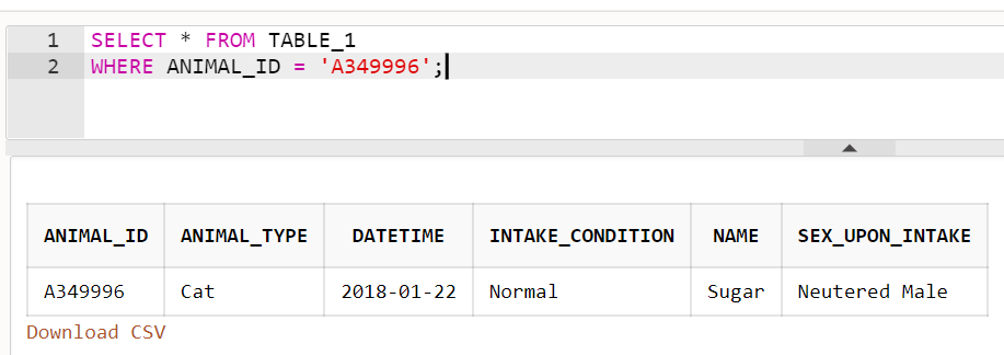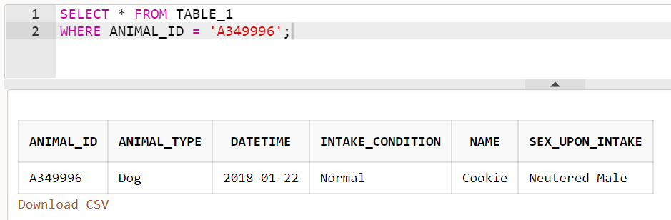- SELECT문에 WHERE절을 사용하여 하나의 데이터만을 골라 출력해주었습니다.