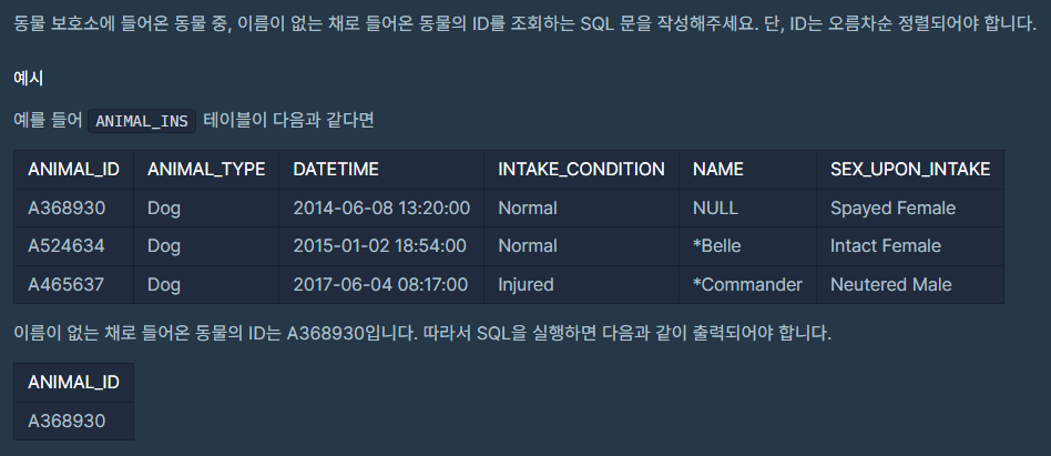 - ANIMAL_INS 테이블의 동물 중 이름(NAME)이 없는 채로 들어온 동물의 ID(ANIMAL_ID)를 조회해야 합니다.