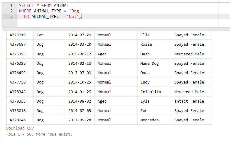 - ANIMAL의 모든 데이터중 동물 타입(ANIMAL_TYPE)이 'Dog'인 데이터와 OR절을 사용하여 동물 타입