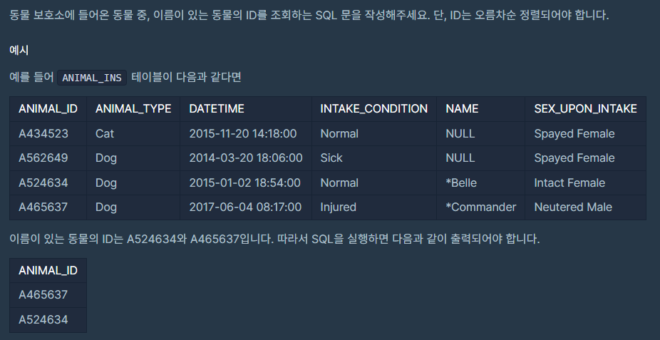 - ANIMAL_INS 테이블의 동물 중 이름(NAME)이 존재하는 동물의 ID(ANIMAL_ID)를 조회해야 합니다.