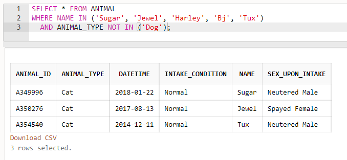 - ANIMAL의 모든 데이터중 IN절을 사용하여 NAME(이름)이 Sugar, Jewel, Harley, Bj, Tux인 동물들을 SELECT하여