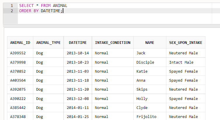 - ANIMAL의 DATETIME을 오름차순으로 정렬(ASC는 생략가능)
