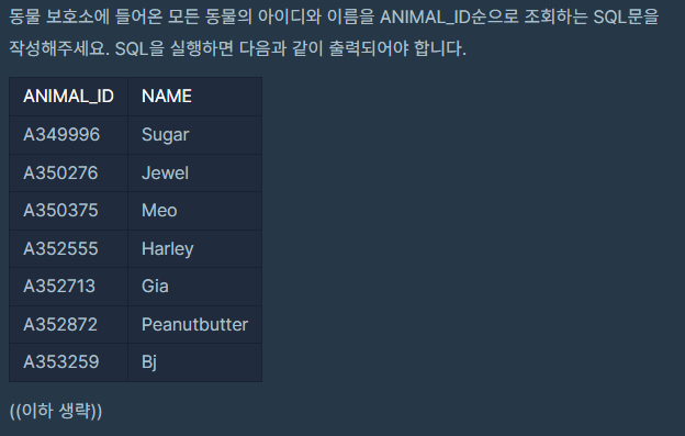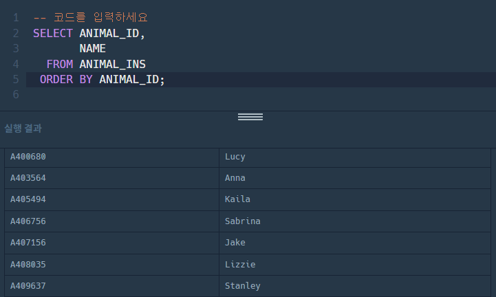 - 그 후 동물의 아이디와 이름 조회를 위해 컬럼은 ANIMAL_ID, NAME 만을 가져와줍니다.