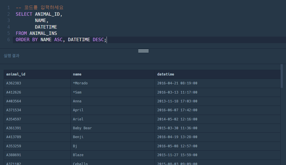 - 그 후 동물의 아이디와 이름, 보호 시작일 조회를 위해 컬럼은 ANIMAL_ID, NAME, DATETIME 만을 가져와줍니다.