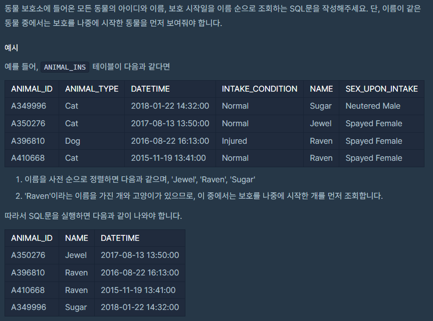 - 이 때 결과는 동물의 이름(NAME)의 순서대로 정렬되어야 하며, 만약 이름이 같다면 보호 시작일(DATETIME)이