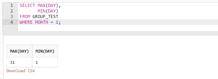- GROUP_TEST 테이블의 조건(WHERE)을 추가하여 1월의 데이터중 날짜의 최댓값 MAX()와 최솟값 MIN()을 조회