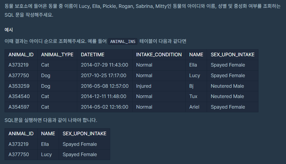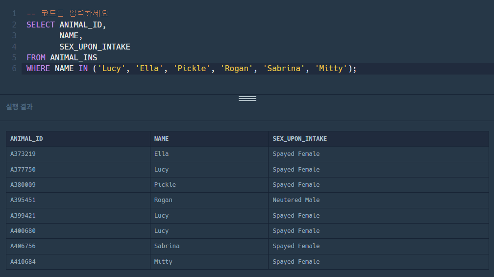 - 이 때 결과는 이름이 Lucy, Ella, Pickle, Rogan, Sabrina, Mitty인 동물들을 조회합니다.