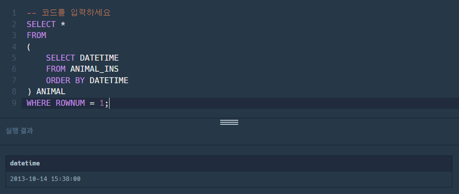 - ANIMAL_INS 테이블의 입양 시간이 제일 먼저 들어온 동물의 입양 시간을 조회해야 합니다.