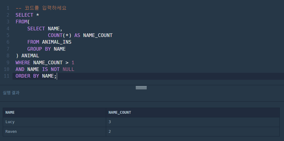 - 서브쿼리에서 가져온 데이터 중 2번 이상 집계된 NAME 조회를 위해 조건절 WHERE을 추가해준다.
