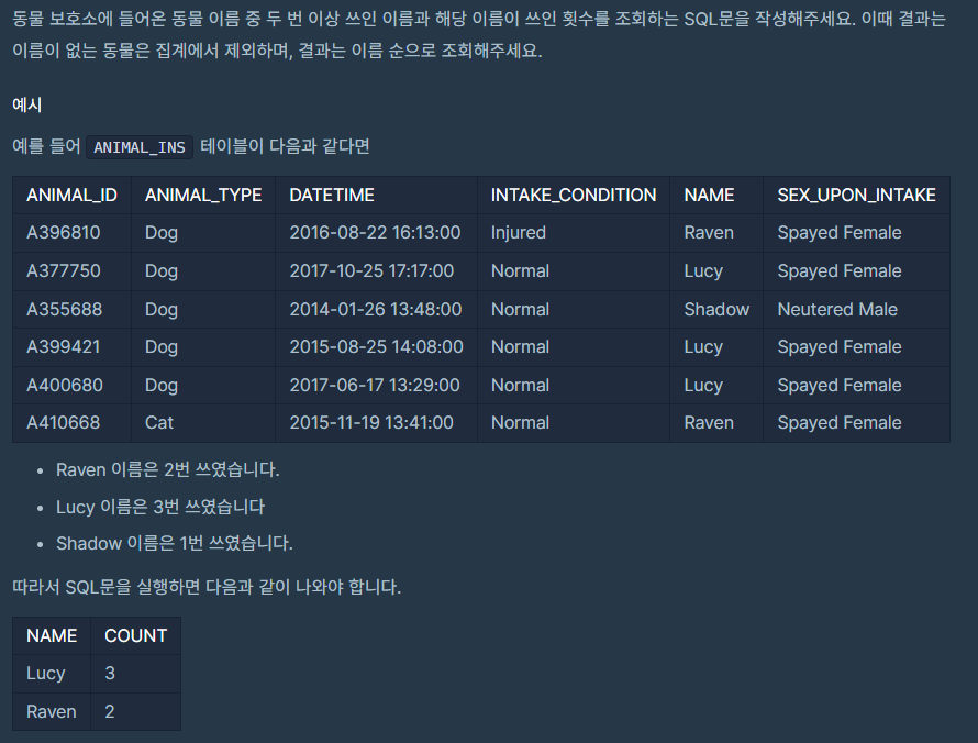 - ANIMAL_INS 테이블의 동물 이름 중 2번 이상 쓰인 이름과 해당 이름이 쓰인 횟수를 조회