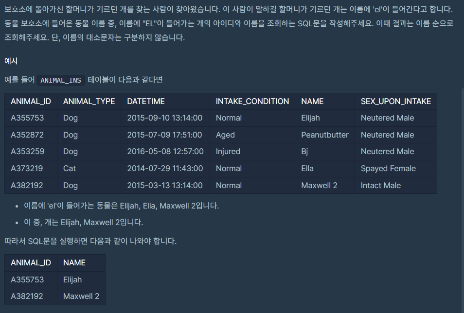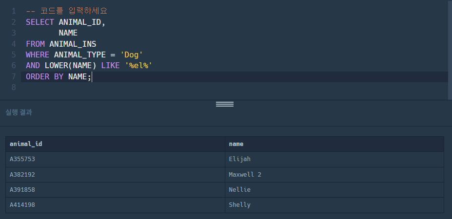 그 후 특정 문자열을 검색해주는 LIKE절을 사용하여 이름에 'el'이 들어가는 동물들만을 조회하게 해줍니다.