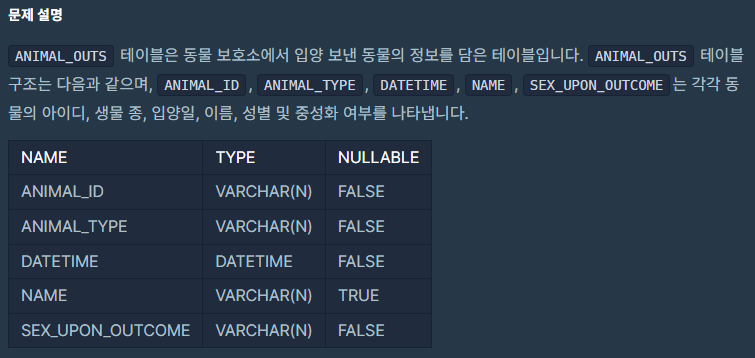 ANIMAL_OUTS 테이블은 동물 보호소에서 입양 보낸 동물의 정보를 담은 테이블입니다. ANIMAL_OUTS 테이블 구조는 다음과 같으며, ANIMAL_ID, ANIMAL_TYPE, DATETIME, NAME, SEX_UPON_OUTCOME는 각각 동물의 아이디, 생물