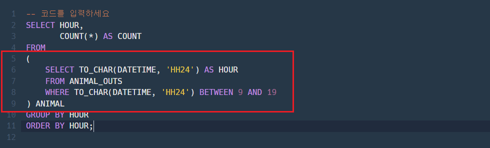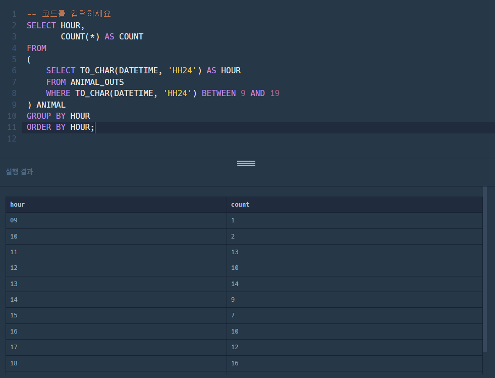 - 갯수 조회 COUNT()를 사용한 후에 그룹화 GROUP BY절을 사용하여 HOUR을 그룹화해줍니다.