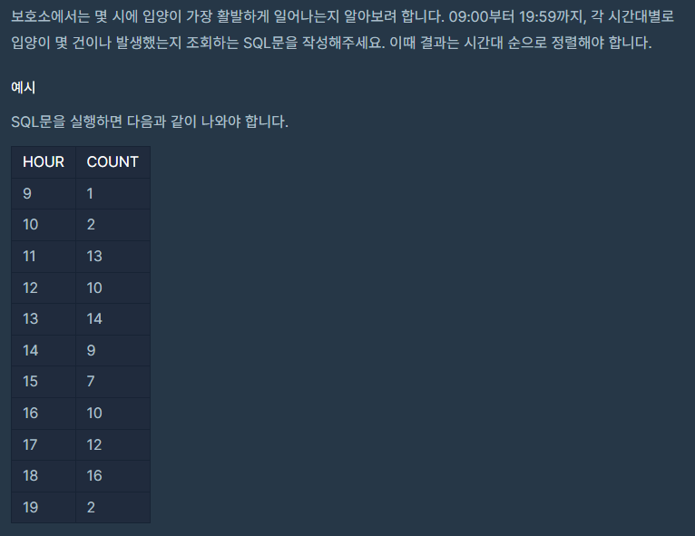 - ANIMAL_OUTS 테이블의 입양시간과 입양 시간대별 건 수를 알아야 합니다.