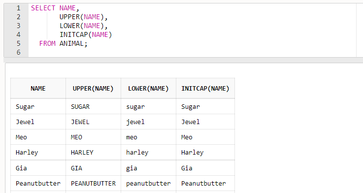 - 데이터의 저장된 원래 이름(NAME)을 대문자(이름), 소문자(이름), 앞글자만 대문자(이름)로 출력이 가능합니다.