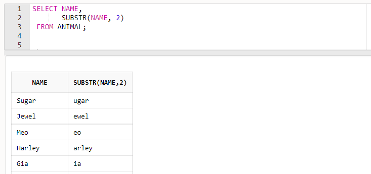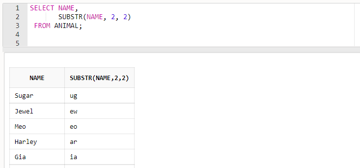 - SUBSTR(컬럼, 2, 2) 쿼리는 컬럼값의 두 번째 철자부터 두 개의 철자를 추출하여 출력합니다.