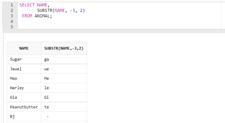 - SUBSTR(컬럼, -3, 2) 쿼리는 컬럼값의 끝에서부터 3번째 철자부터 두 개의 철자를 추출하여 출력합니다.