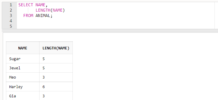 - LENGTH() 함수는 문자열의 길이를 출력하는 함수입니다.