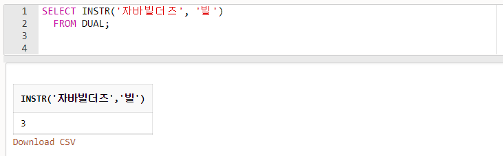 - INSTR() 함수 안에 찾고 싶은 문자열이나 컬럼을 적어주고, 찾고 싶은 철자를 적어줍니다.