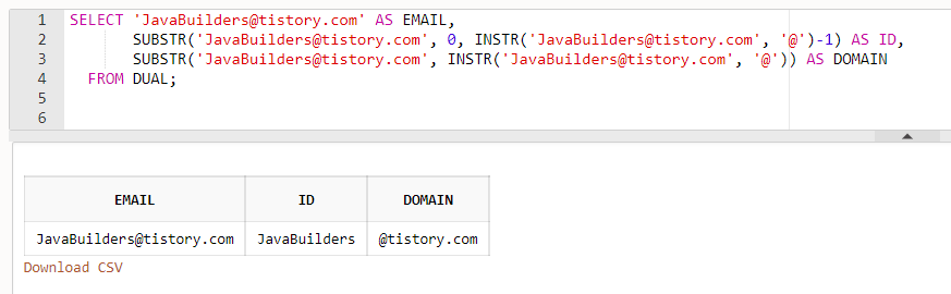 - 글자 위치 찾기 INSTR()과 문자열 자르기 SUBSTR()을 이용하면 이메일 주소를 @를 기준으로 ID와 DOMAIN으로 나눌 수도 있습니다.