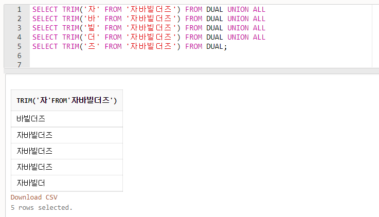- TRIM()과 LTRIM(), RTRIM()의 특정 문자 잘라낼 때의 문법이 조금 다른데, TRIM()은 FROM을 사용하여 TRIM() 안에 옵션이 하나만 들어가지만, LTRIM()과 RTRIM()은 , 을 사용하여 옵션이 2개가 들어갑니다.