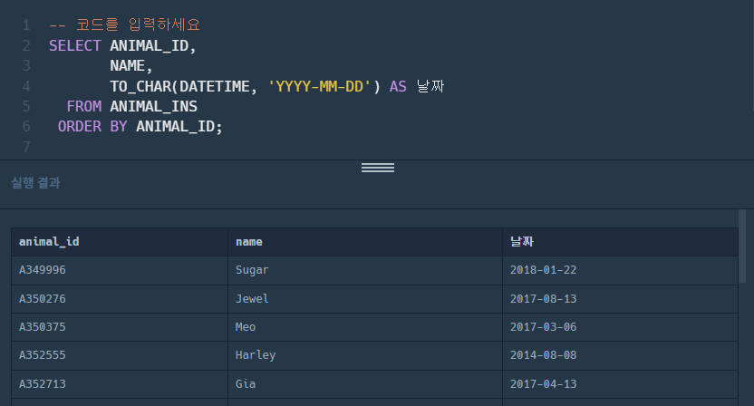 - 형 변환 TO_CHAR()으로 사용하면 DATE형인 들어온 날짜 컬럼인 DATETIME을 원하는 문자 형식으로 변환시켜줄 수 있습니다. YYYY-MM-DD는 각각 연도, 월, 일입니다.