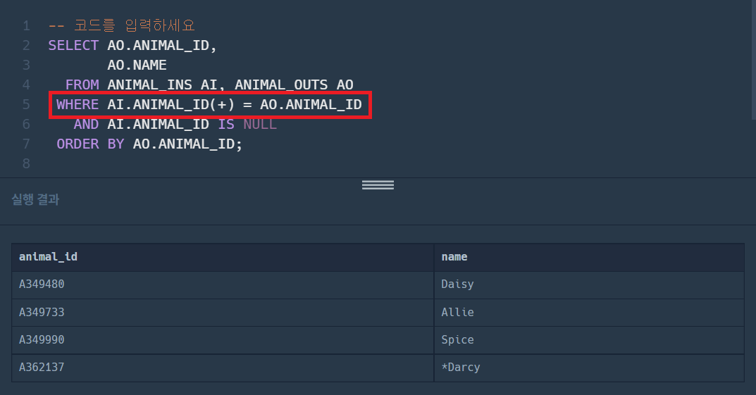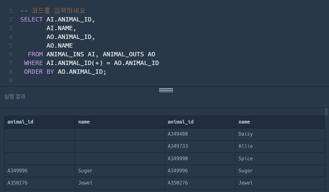 그러므로 ANIMAL_INS의 ID에 (+)를 주어 RIGHT OUTER JOIN이 되게 합니다.