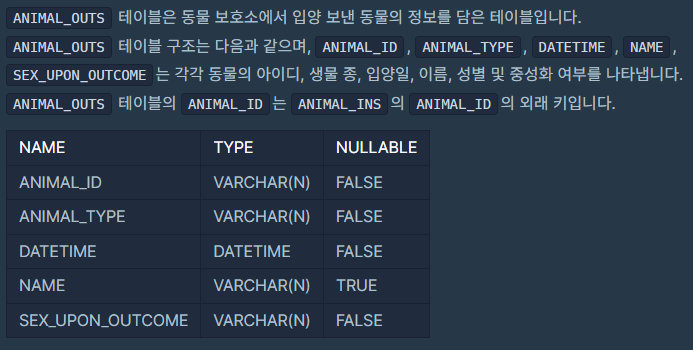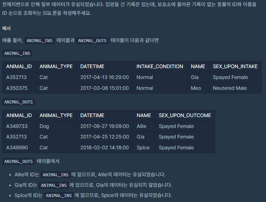 - ANIMAL_INS의 데이터가 유실되어 ANIMAL_OUTS이 기준이 되어야 합니다.