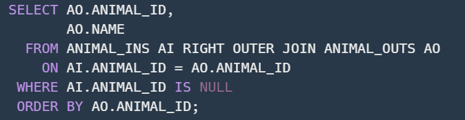 - ANIMAL_OUTS의 ANIMAL_ID는 ANIMAL_INS의 외래키이므로 서로의 ID를 = 을 사용하여 연결시켜줍니다.