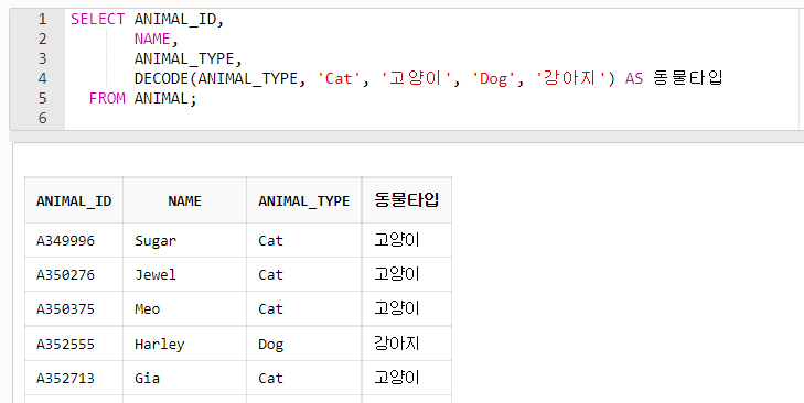 - DECODE()를 이용하여 동물의 타입을 값에 맞게 한글로 변환해 출력하였습니다. ELSE는 생략하였습니다.