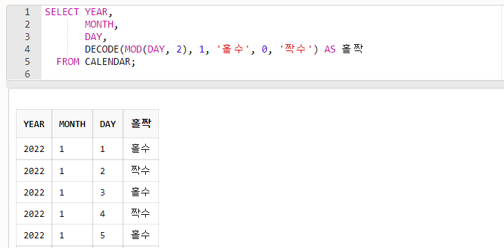 - IF문 함수 DECODE()와 나머지 출력 함수 MOD()를 사용하여 DAY의 값을 2로 나눈 값이 1이면 홀수가, 0이면 짝수가 출력되게 하였습니다.