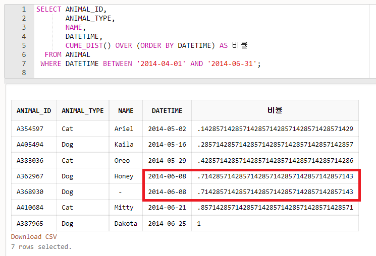 - CUME_DIST()를 사용하여 특정 날짜의 입양한 동물들을 입양 날짜의 비율로 나누어 출력하였습니다.