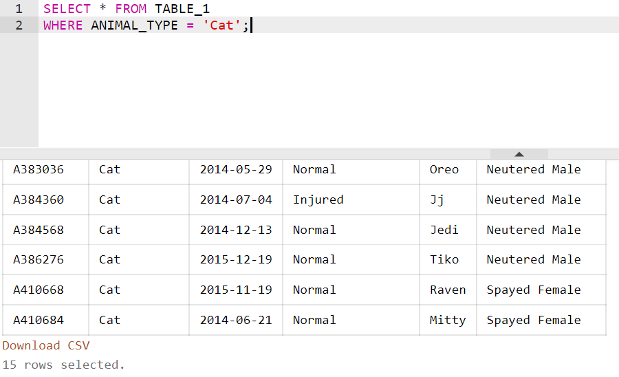 - TABLE_1의 모든 데이터중 ANIMAL_TYPE이 'Cat' 인 것만을 조회해주었습니다.