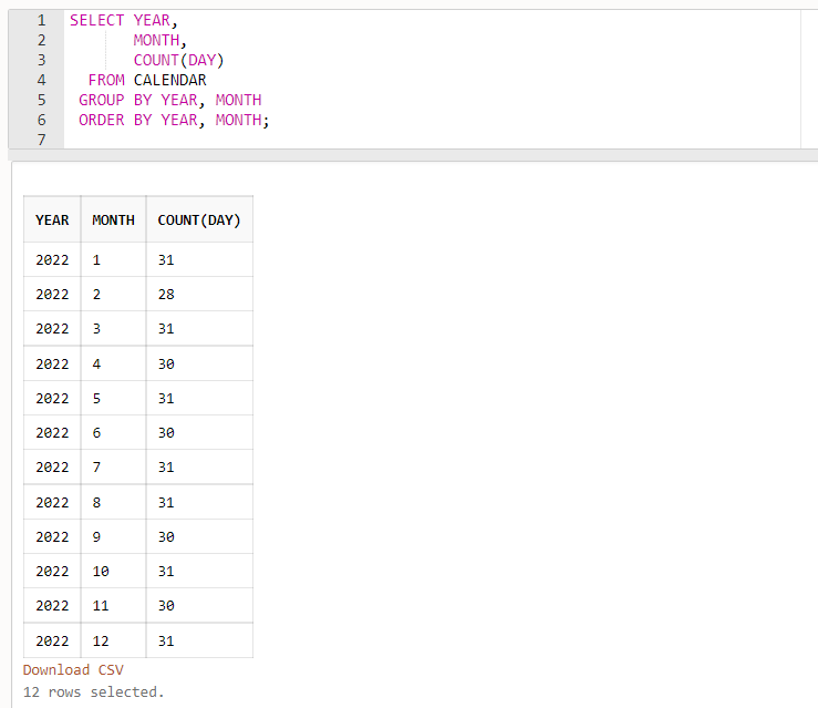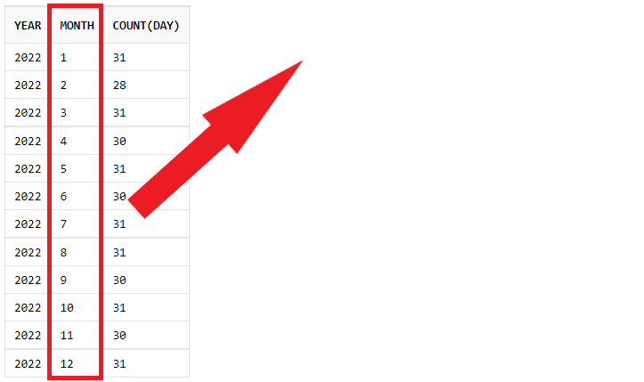 - 그룹함수 COUNT()를 사용하여 달력 테이블의 일(DAY)의 개수를 출력하였습니다.