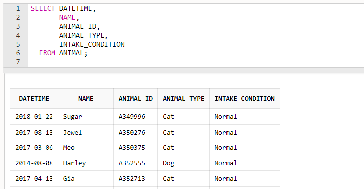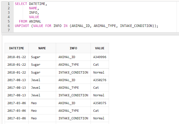 - 이제는 UNPIVOT()을 사용하여 가로로 출력된 데이터를 동물의 NAME을 기준으로 하여 세로로 출력하여 보겠습니다.